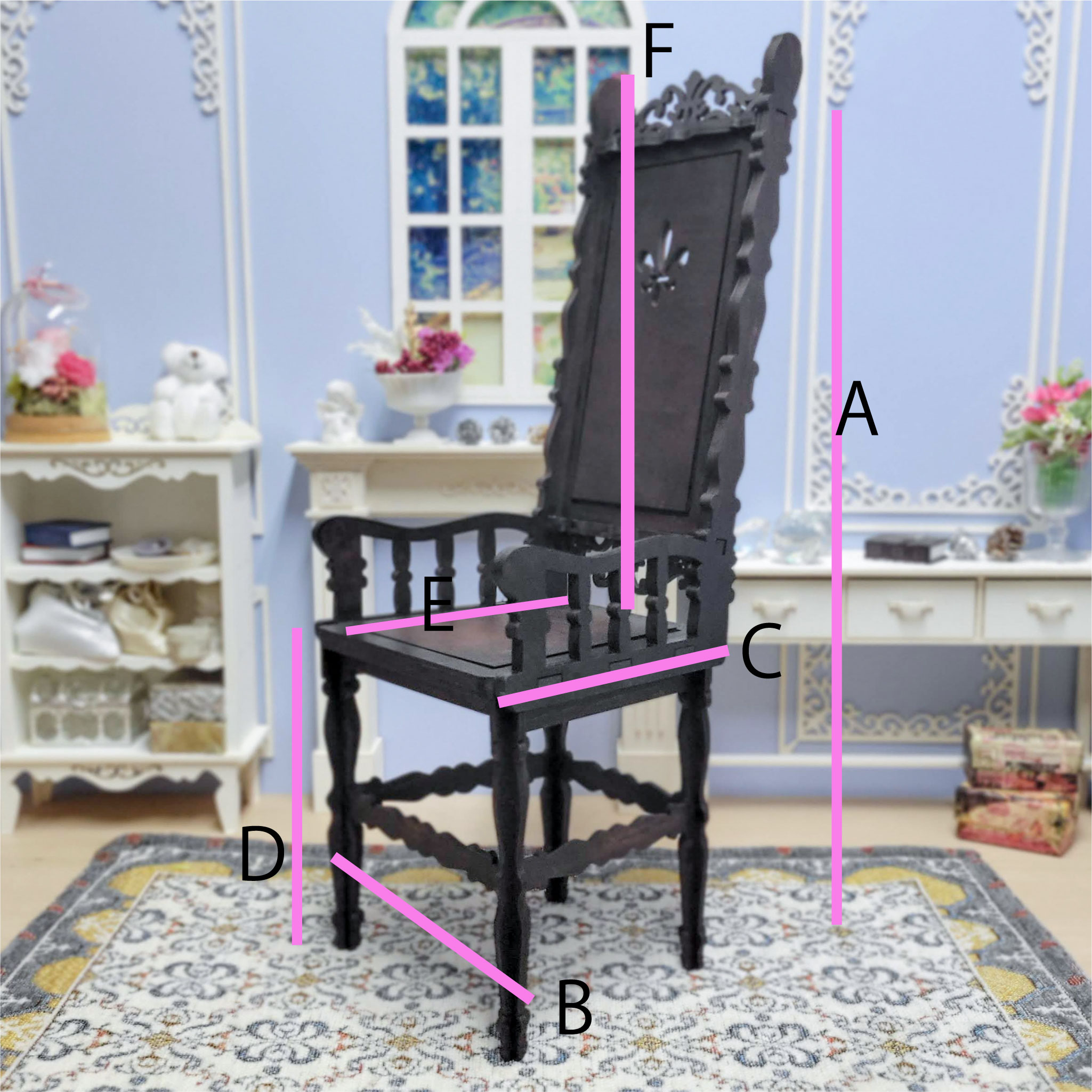 A:全長43.5㎝ B:横幅19.5㎝ C:奥行19㎝ D:床から座面までの高さ 20㎝ E:座面手前から背面部まで15.5㎝ F:座面から椅子最長部まで24.5㎝