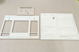 6.透かし彫りのBOXを組み立てます。底板に後ろ側の板を貼ります。次に向かって右側が丸く深くカーブになっている面、左側がなだらかなカーブの板を貼りつけます。正面に透かし彫りの板を貼ります。