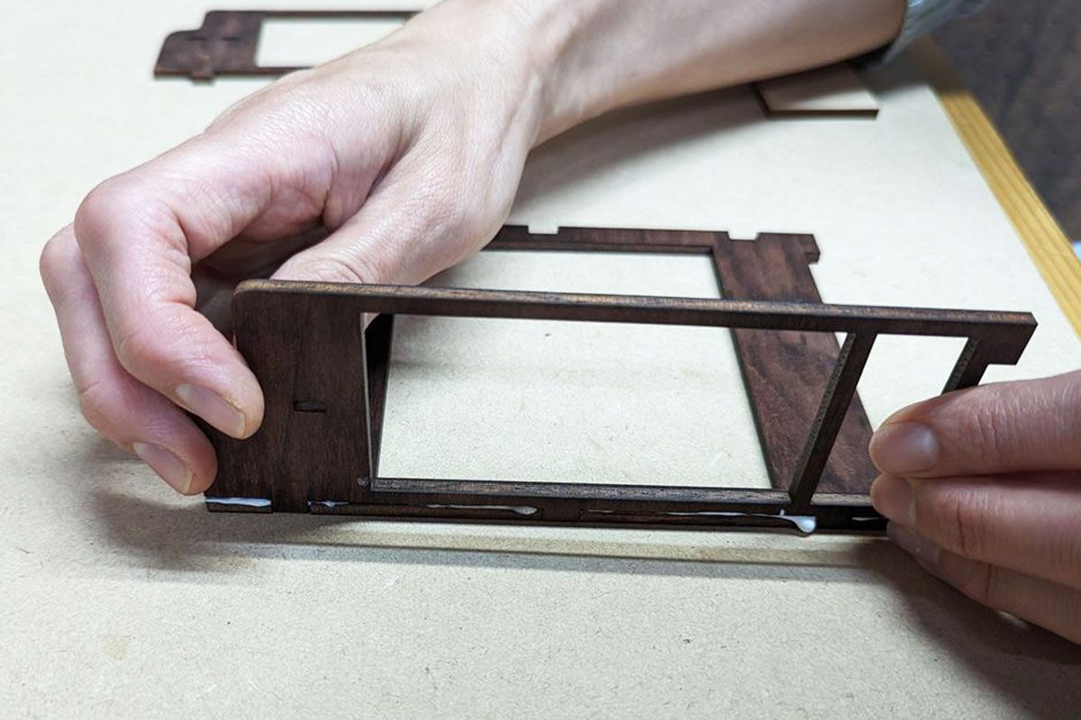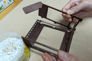 2.まず側面の板を背面板に張り合わせます。(写真は塗装状態の物で撮影しています。)