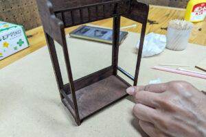 9.引出しの取手にボンドをつけ引き出し正面の穴に差し込み貼り付けます。