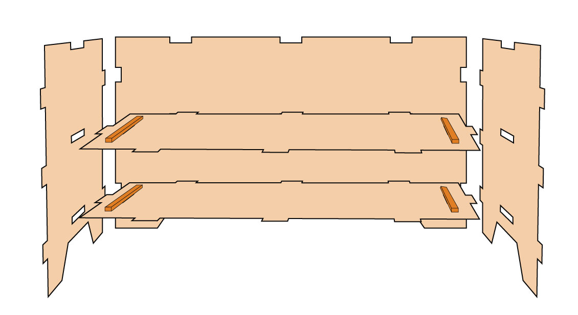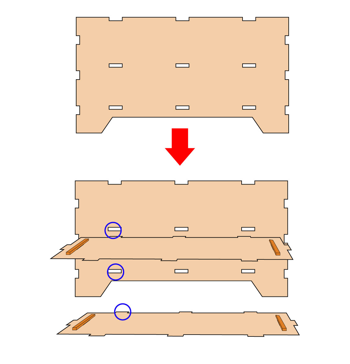 4.まず穴が開いている内側用の側面板に棚板パーツをボンドをつけて差し込み接着します。次に一番大きな板が書棚の背面になります。背面板の穴に側面板と棚板をボンドで差し込み接着します。イラストの同じ色の丸部分が接着部です。