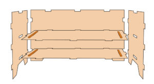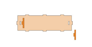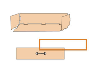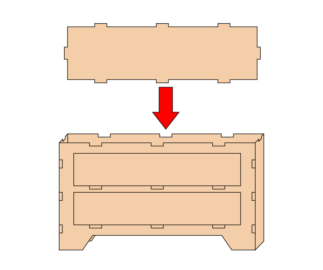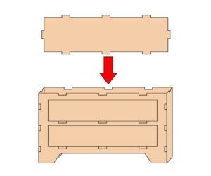 3.2で使用した板と、写真の赤枠内の板を使用してチェスト本体を作ります。まず背面板に2で突起を張り付けた板を上側にしてイラストのように穴が開いているところに2枚とも差し込んでボンドで留めます。