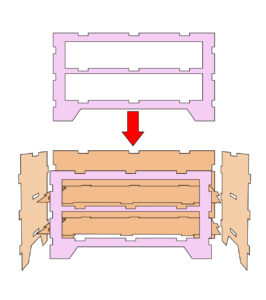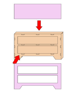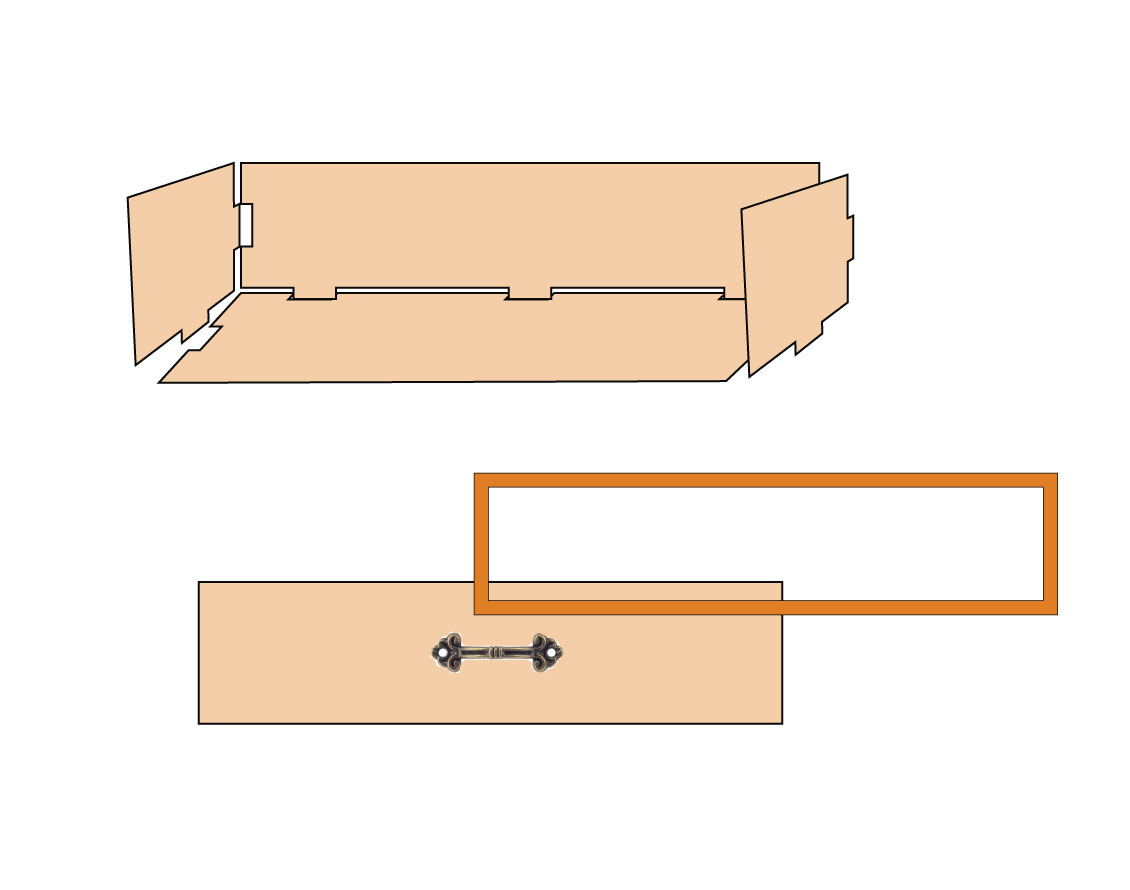 7.引き出しを作ります。イラストのように組み立てます。箱型に組立、正面板を貼ります。正面板には先に金具を付けておきましょう。金具は割りピンでとめる仕様にしているから簡単です。穴に入れて裏からピンを出し2枚重ねになっているので金具を左右に広げて留めます。割りピンは失くしやすいので多めに入っています。最後に飾り枠を貼りつけて引き出しを2つ作ります。