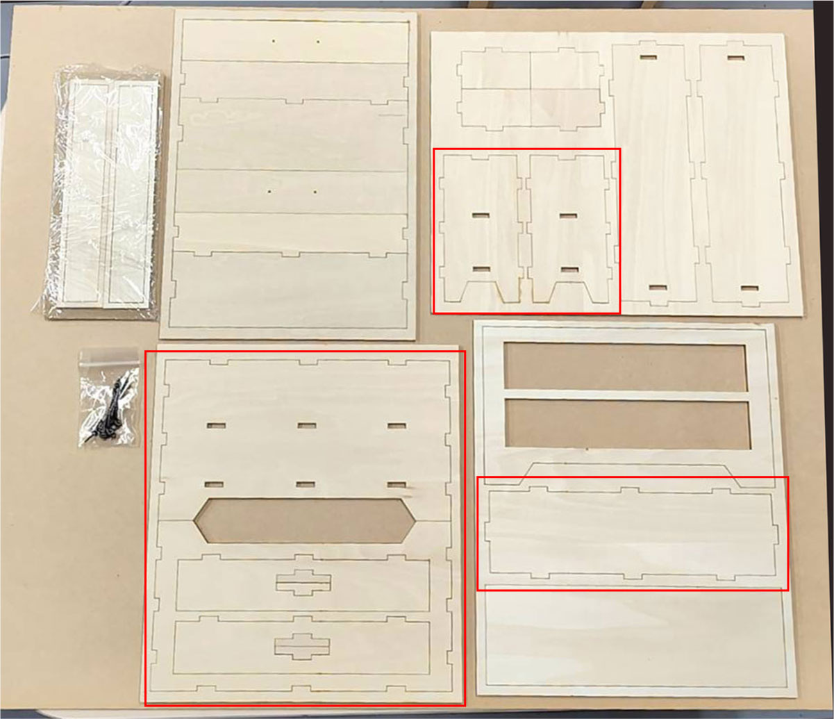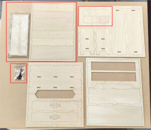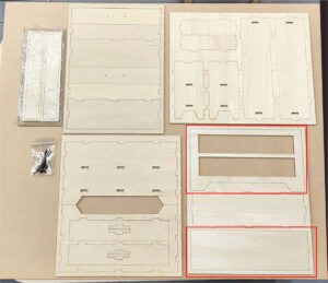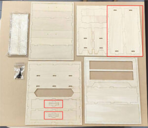 2.最初に赤枠内のパーツを組立てます。マスキングテープで木枠にとめてあるものは外してください。写真のパーツを穴が開いているところにボンドで差し込んで留めます。2枚2か所づつ留めます。