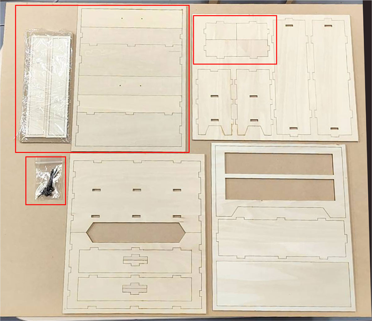 3.最初に赤枠内のパーツを組立てます。マスキングテープで木枠にとめてあるものは外してください。