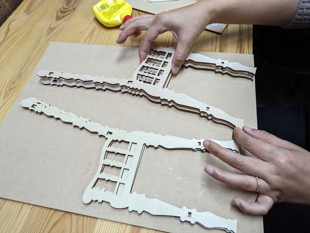 ボンドで貼り付ける間、シナベニヤの特性上曲がりやすいので沢山洗濯ばさみが必要です。100円ショップ等でご用意ください。