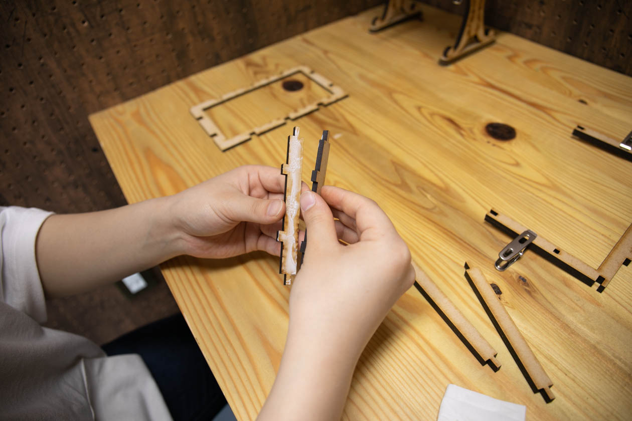 6.次に先ほど貼りつけた2枚一組の脚と、貼り合せていない1枚づつの脚パーツを、側面の脚に貼り付けます。この時写真を見ながら貼り付ける場所を間違えないようにしてください。凸凹した突起がある方側は天板受けのパーツを貼るんでそちらではないので気を付けてください。 |